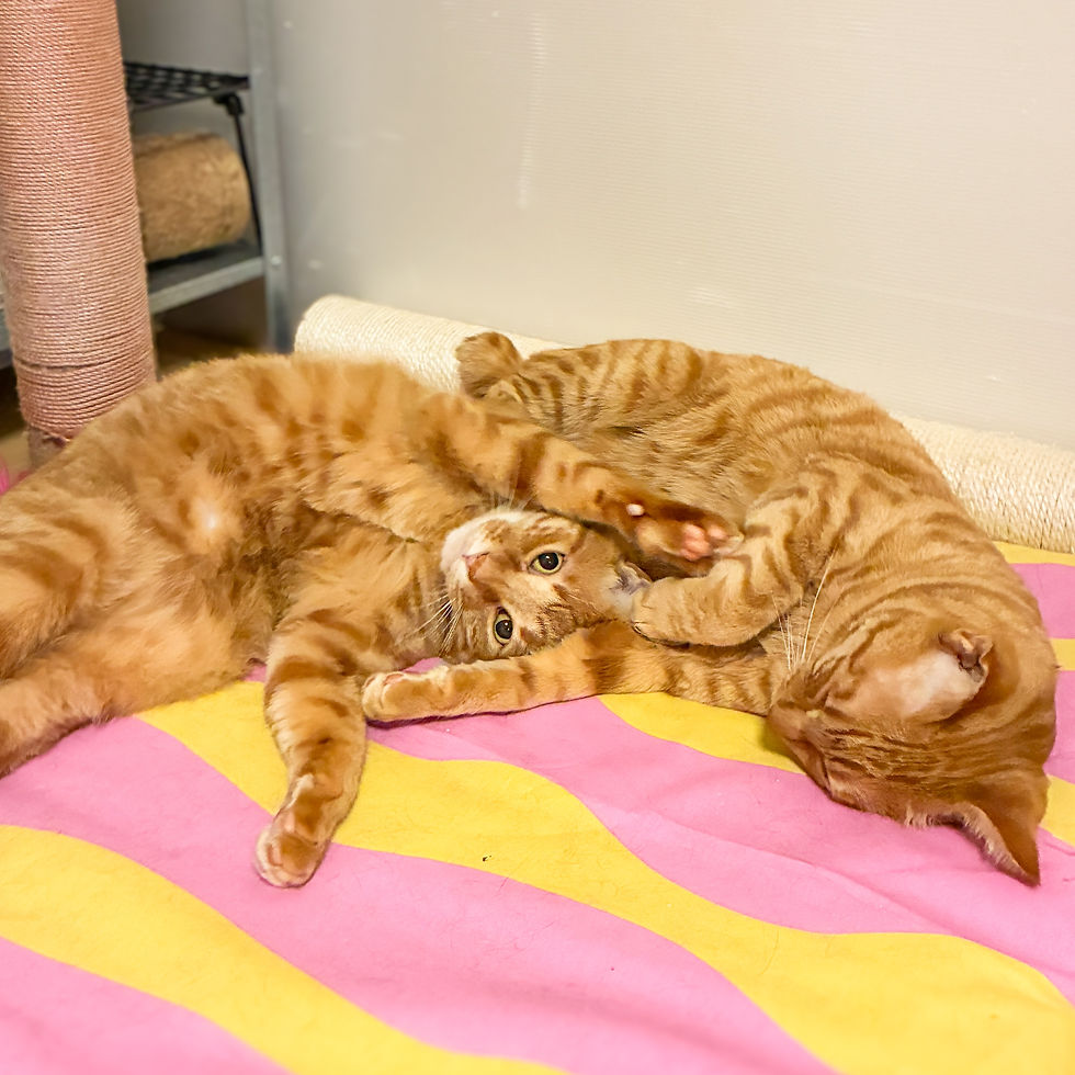 兄弟の中では一番大きい子(※といっても5.5kgくらい)で、いちばん人に対して攻撃的でした。現在では鼻ツン挨拶ができ、おやつをお行儀よく一粒ずつ手から上手につまみます。ご飯に夢中になっている時には少し触ることもできますが、まだ人とは距離を取っている感じではあります。オヤツのおねだりで人に近づきじっと見つめます。オモチャで遊ぶのも大好きなので、将来人に慣れてくれる可能性はあると思います。