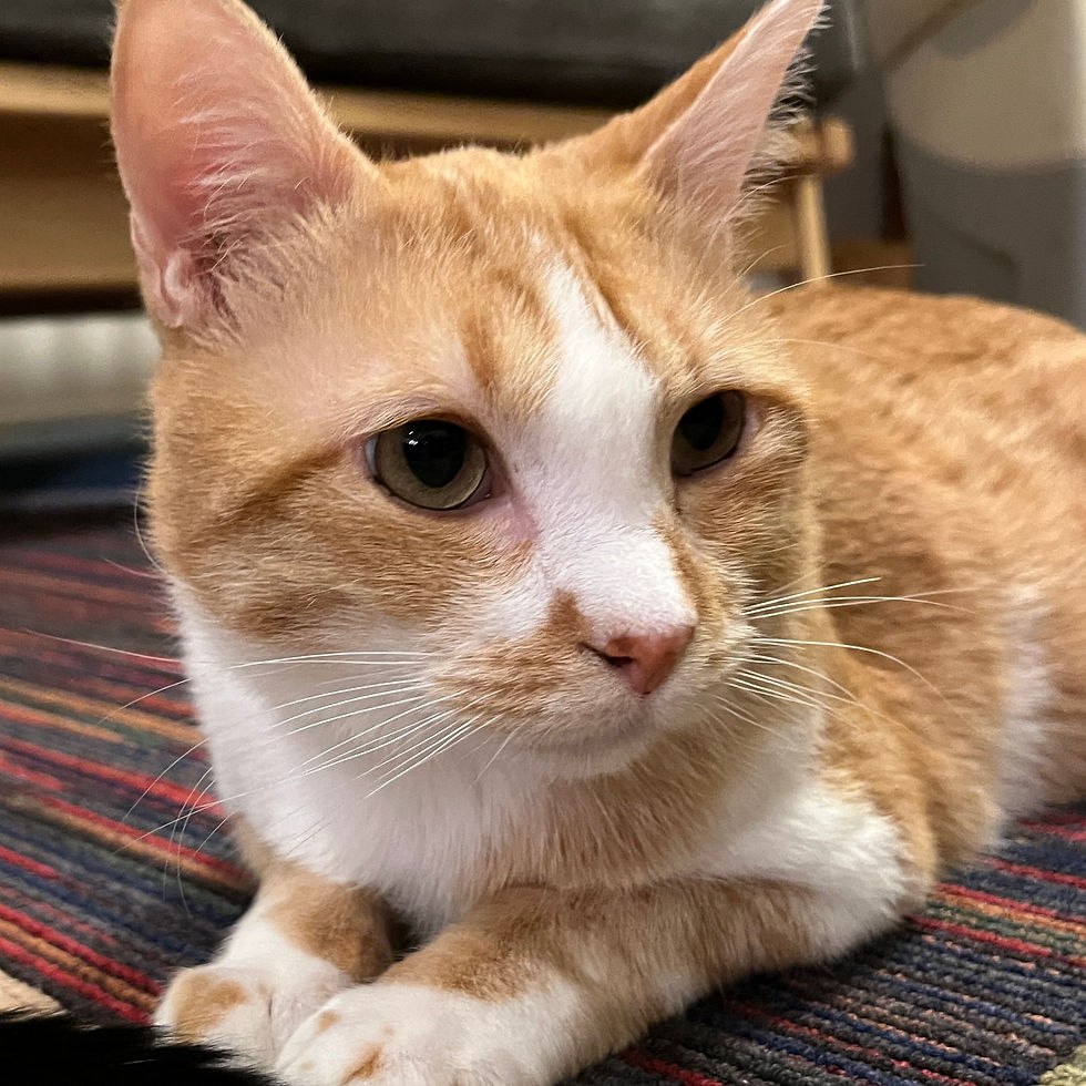 とっても甘えん坊のカスタードくん。人にはどこにでもついてくるストーカー猫で、実は猫にも甘えん坊さん。みんなに頭突きで好意を伝えまくり、とっても愛情深い子です。
